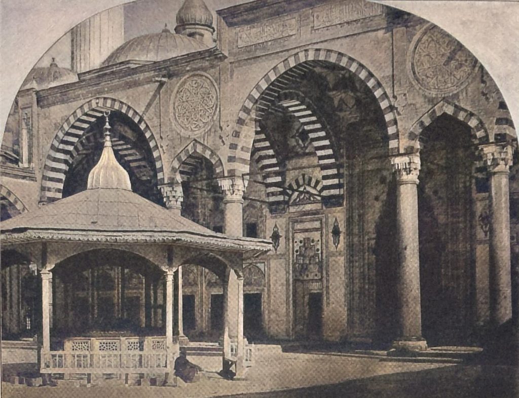 Treten wir durch das Portal in den Vorhof, so befinden wir uns in einer von Säulen getragenen, weiten Bogenhalle, deren Decke von einer Reihe zierlicher Hängekuppeln gebildet wird. Während diese Halle einen freien Hofraum in der Mitte von drei Seiten gleichmässig umgiebt, erhebt sie sich an der Zugangsseite des Gebetraumes zu höheren Maassen und prächtiger Wirkung.