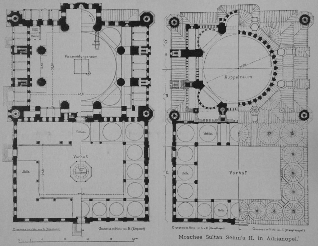 Ein neues Moment der Entwickelung, in welchem sich nebenbei auch bereits byzantische Einflüsse in den Gewölbeformen deutlich verspüren lassen, tritt sodann mit der Verlegung der Reichsgewalt nach Europa und der Wahl Adrianopels als Herrschersitz auf. Schon die ersten, bald nach der Uebersiedelung entstandenen Moscheen zeigen dasselbe. Die Grundriss-Anordnung erweitert sich hier zu der später für alle grösseren Moscheen typisch gewordenen Form eines einheitlich zusammen gefassten Betraumes als Haupttheils des Gebäudes mit einem vorgelegten offenen, von Hallen umgebenen Hofraum – eine Form, deren Anwendung demnächst fast zu einem ausschliesslichen Vorrecht der Kaiserlichen Bauherrn wurde. Die von Murad II(1421 bis 1451) erbaute „Moschee mit den drei Galerien“ (Uetsch Scherfeli Djami) soll die erste Moschee sein, welche diese Bereicherung des Baugedankens in einer organischen Verbindung der genannten, an sich so verschiedenartigen Haupttheile des Gebäudes zeigt. [Vergl. v. Hammer, Geschichte des osmanischen Reiches S. 375. Die Moschee ist ferner ausgezeichnet mit 4 Minarets, von denen eins 3 Galerien und spiralförmige Treppenläufe erhalten hat. Endlich ist sie für die Landesgeschichte besonders merkwürdig als erste, die mit der Stiftung eines Hauses der Ueberlieferungsschule (Darul-Hadis) ausgestattet ist.] Noch scheint sich aber die Grundform des Gebetsraumes selbst, abgesehen von den Grössen-Verhältnissen, nicht wesentlich von denen zu Brussa zu unterscheiden. [Verfasser vermag dies nur soweit zu bestätigen, als es sich aus dem Aeusseren schliessen lässt, da ihm eine Besichtigung des Inneren nicht möglich war.]