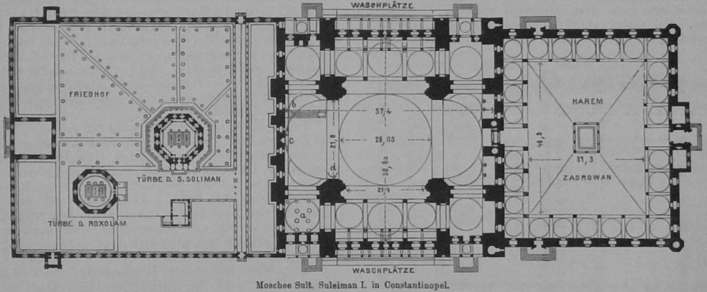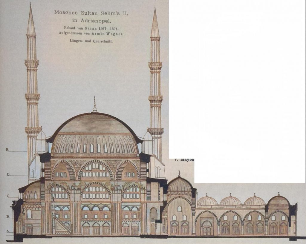 Bei seinem dritten grossen und Meisterwerke aber sehen wir Sinan auf völlig eigener Bahn und der Verwirklichung einer Raumidee folgend, welche nur, wie oben berührt, in der Mehmed-Pascha-Moschee einen in gewissem Maasse verwandten aber noch unscheinbaren Vorläufer gefunden hatte. Wir glauben hierbei von anderen bereits auf polygonaler Grundform errichteten Bauwerken, wie den Mausoleen (Türben) – als nicht in diesen Bereich fallend und von geringfügiger Bedeutung – absehen zu dürfen. –