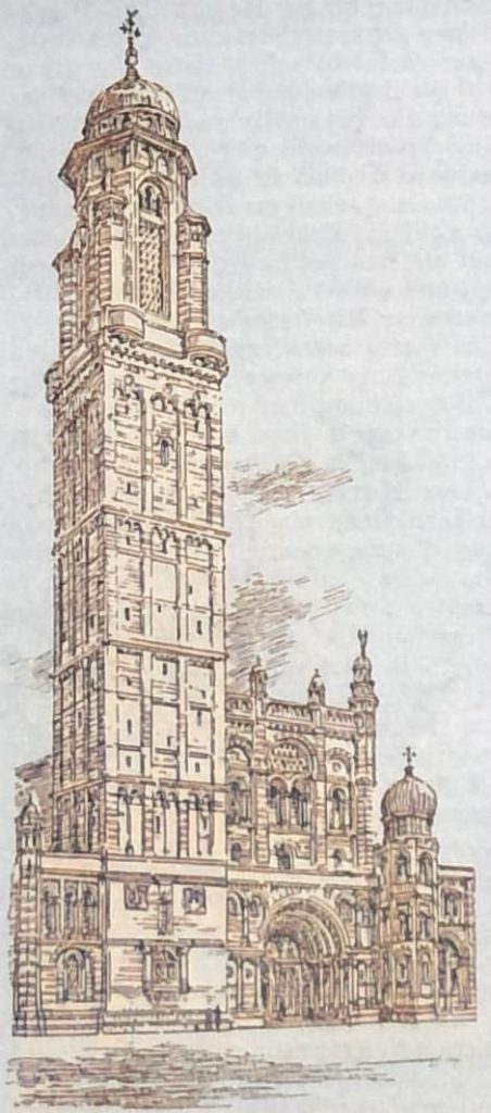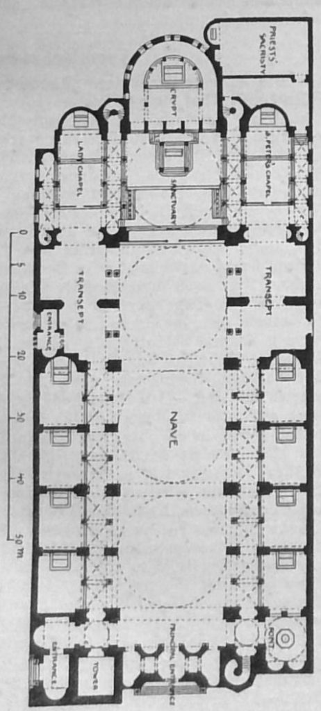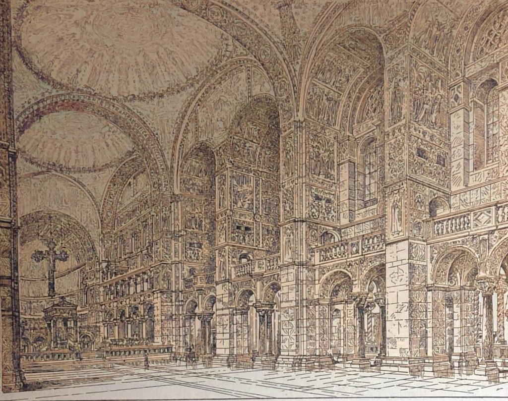 Mit dem Entwurf für die Kirche wurde John F. Bentley, ein Architekt betraut, der sich durch eine Reihe von Ausführungen im gothischen Stile, sowie durch eine Anzahl von Wiederherstellungen und Ausschmückungen von Bauwerken im Stile der Renaissance den Ruf eines künstlerisch bewährten Architekten erworben hat. Man wird mit Interesse vernehmen, dass zuerst der Gedanke bestand, die neue Kathedrale im Stile der alten Peterskirche in Rom zu errichten und Bentley verbrachte in der That mehre Monate in Italien, besonders in Rom, Ravenna und anderen für die Entwicklung der Basilika wichtigen Städte, um aufgrund eines umfangreichen Sammelmateriales die ersten Gedanken für einen Entwurf im Stile der altchristlichen Basilika zu fassen. Er kam jedoch im Laufe weiterer Studien zu der Ansicht. dass sich die altchristliche Basilika nicht für eine Behandlung nach modernen Grundzügen und Bedürfnissen, namentlich nicht für Londoner Verhältnisse eigne. Der architektonische Reiz. der von anderen Bauwerken entlehnten Säulen lässt sich nicht nachahmen; die Schönheiten des hölzernen Dachstuhles müssen den modernen Forderungen der Feuersicherheit weichen usw.; kurzum er stand von dem Gedanken ab und wandte sich einem glücklicheren zu, die neue Kirche in den Formen des byzantinischen Stiles mit Benutzung von San Marco in Venedig, San Vitale in Ravenna und San Ambrogio in Mailand zu entwerfen. In dieser Fassung wird sie durch die beistehenden Abbildungen vorgeführt.
