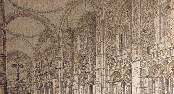 Die äussere Höhe des Schiffes wird 90’ = 27,5 m erreichen. Im Innern wird dasselbe bei 280’ = 85,1 m Länge eine lichte Weite von 60’ = 18,3 m haben. Das Schiff besteht aus 4 grossen Gewölbe-Systemen von welchem sich an das dritte, vom Haupteingang an gerechnet, eine Art Querschiff rechts und links angliedert, während das vierte Gewölbe-System den Altarraum mit Chorgestühl überdeckt. An den Altarraum schliesst sich in der Hauptaxe eine absidenartig angebaute Krypta. Gegen die seitlichen Theile des Querschiffes öffnen sich 2 grössere Kapellen, die eine der hl. Jungfrau, die andere dem St. Petrus geweiht. Je 2 kleinere Kapellen, die sich rechts und links an die vorderen beiden Gowölbe-Systeme anschliessen, machen aus dem Grundriss eine Art versteckter fünfschiffiger Anlage. Ein Haupt- und 2 Seiteneingänge gewähren Zutritt zu dem durch hohes Seitenlicht erleuchteten, als basilikale Anlage durchgeführten Innern. Das Gewölbe-System mit seinen Untertheilungen ist aus der Innenansicht deutlich zu ersehen. Reiche Untertheilungen in glücklichen Maasstabe hat der Altarraum erfahren, in dem die Mensa unter einem von 4 Säulen getragenen altchristlichen Baldachin steht. Die perspektivische Wirkung gegen den Altarraum mit dem Schlussblick in das Gewölbe hinter der Altarschranke ist eine ausserordentlich glückliche. Von gleich glücklicher Wirkung ist der Gesammteindruck des Innern, bei dem das Prinzip der breiten, für reiche Darstellungen in Mosaik und anderer Monumental-Malerei vorbereiteten Flächen mit hoher künstlerischer Vollendung durchgeführt ist.