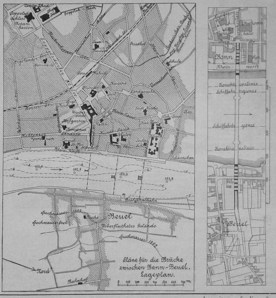 Wo sonst der Rhein durch gewaltige Brücken-Bauwerke in älterer und neuerer Zeit überspannt worden ist, zwischen Mannheim und Ludwigshafen, Mainz und Kastel, Koblenz und Ehrenbreitstein, Köln und Deutz, Düsseldorf und Oberkassel bezw. Krefeld usw., da galt es, grosse industriereiche Städte mit einem reich entwickelten Hinterlande mit einander zu verbinden. Und wenn nunmehr eine verhältnissmässig bescheidene Provinzial-Stadt mit etwa 45 000 Einwohnern schon seit längerer Zeit den Wunsch hegt, mit einem weit bescheideneren Orte, Beuel, und mit seinem allerdings landschaftlich schönen Hinterlande, jedoch mit einem Hinterlande von einer industriellen Entwicklung, die sich immerhin in engeren Grenzen bewegt, verbunden zu sein, so ist das ein Zeichen dafür, dass die Forderungen des modernen Verkehrs keineswegs mehr ausschliesslich die sind, welche Industrie und Handel stellen, sondern dass man sich mehr und mehr gezwungen sieht, auch anders gearteten Verkehrsbedürfnissen Rechnung zu tragen, Entstanden früher Verkehrsbauwerke fast ausschliesslich aus volkswirthschaftlichen Erwägungen, so sind heute vielfach schon auch die allgemeinen Lebensbedingungen dafür maassgebend.