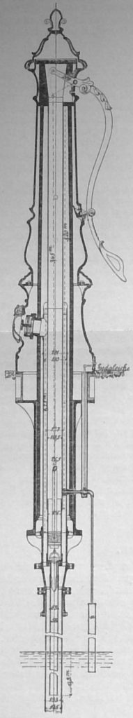 Die Leistung eines Brunnens soll auf den Hub 1 l betragen, und die angewendete Kraft 10 kgm nicht überschreiten. Der gusseiserne Brunnenpfosten wird auf die Fundamentplatte eines fest in die Erde gestampften gusseisernen Sockels geschraubt. Die Verbindung desselben mit dem Mantelrohr geschieht wie folgt: Der untere Tragring wird auf das Mantelrohr gelöthet, auf dem oberen lose übergeschobenen Passring ruht mittels der an das Mantelrohr geschraubten Schwelle der Brunnenpfosten nebst Sockel. Beim Flachbrunnen ist das Mantelrohr gleichzeitig Saugerohr für die Dampfspritze. Aus diesem Grunde wird das Saugerohr in dem Theil, der vom Grundwasser berührt wird, aus Kupfer hergestellt und gitter oder siebartig durchbrochen; sodann wird ein grossmaschiges Netz aus Kupferdraht, dessen Maschen etwa doppelt so weit sind als eine der gitterförmigen Durchbrechungen, unverrückbar um dasselbe gelegt und zuletzt noch um dieses sehr feine dauerhafte Kupfergaze gespannt. Ebenso ist das Mantelrohr an allen Stellen, wo es durch tiefere wasserhaltige Stellen geht, gleichfalls als Saugkorb auszubilden. Die lichte Weite des Saugers bei Tiefbrunnen beträgt 94,5 mm bei 102 mm äusserem Durchmesser. An seinem oberen Ende ist ein Bronzering aufgelöthet, um das Herausnehmen zu erleichtern. Bei Flachbrunnen ist eine lichte Weite von 58 mm bei 63 mm äusserem Durchmesser erforderlich. Die Kuppelung der einzelnen Rohre ist in der Weise zu bewirken, dass sie nach innen bündig stehen, die Muffen also nach aussen vorstehen. Die lichte Weite des Steigerohrs beträgt 118,5 mm bei 127mm äusserem Durchmesser. Dasselbe ist am Pumpenstiefel mittels Gewinde angeschraubt. Die Ausflusstülle des Brunnens liegt in einer Höhe von 930 mm über Bordkante und ist in das Steigerohr eingeschraubt.