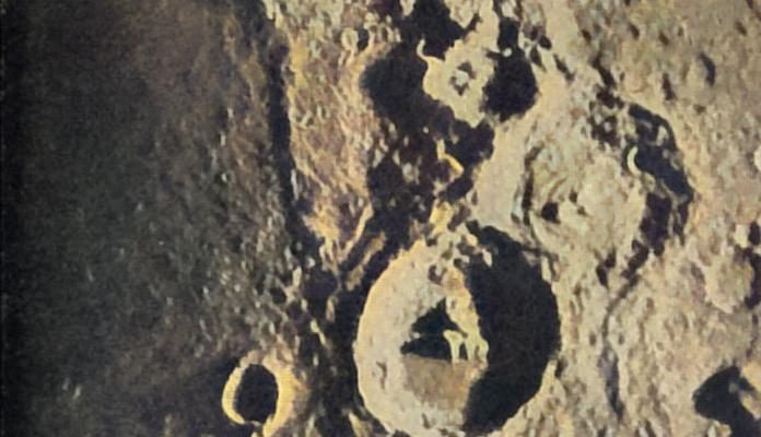 Für den Mond taugt der neue Reflektor schon weniger, weil hier nicht Lichtstärke, sondern scharfe Definition ins Gewicht fällt, weshalb ein Refraktor bessere Resultate liefert. Dies sieht man aus Abb. 4, wo die prächtige Gruppe der Ringgebirge Theophilus, Cyrillus und Katharina wiedergegeben ist, so wie sie am größten Refraktor der Welt, am 40 Zöller der Yerkessternwarte, bei Anwendung eines farbigen Glases von Ritchey aufgenommen wurde. An Deutlichkeit des Details übertrifft sie alles bisher von der Photographie Erreichte, wenngleich unser Fernrohr natürlich noch immer weit mehr und weit feineres Detail zu zeigen vermag.