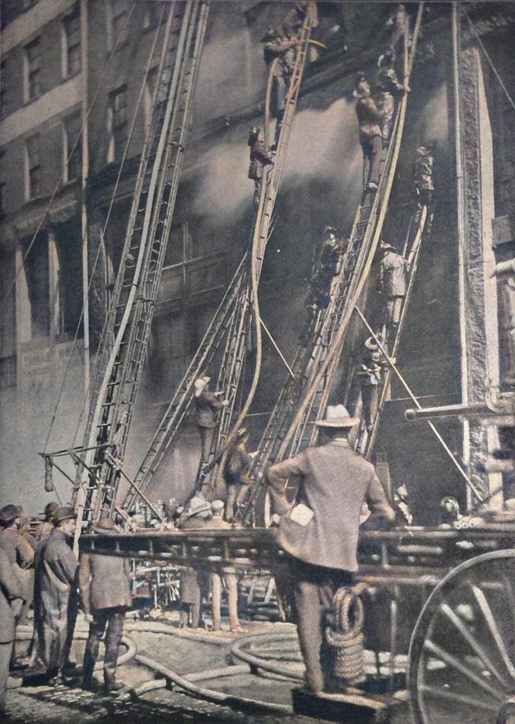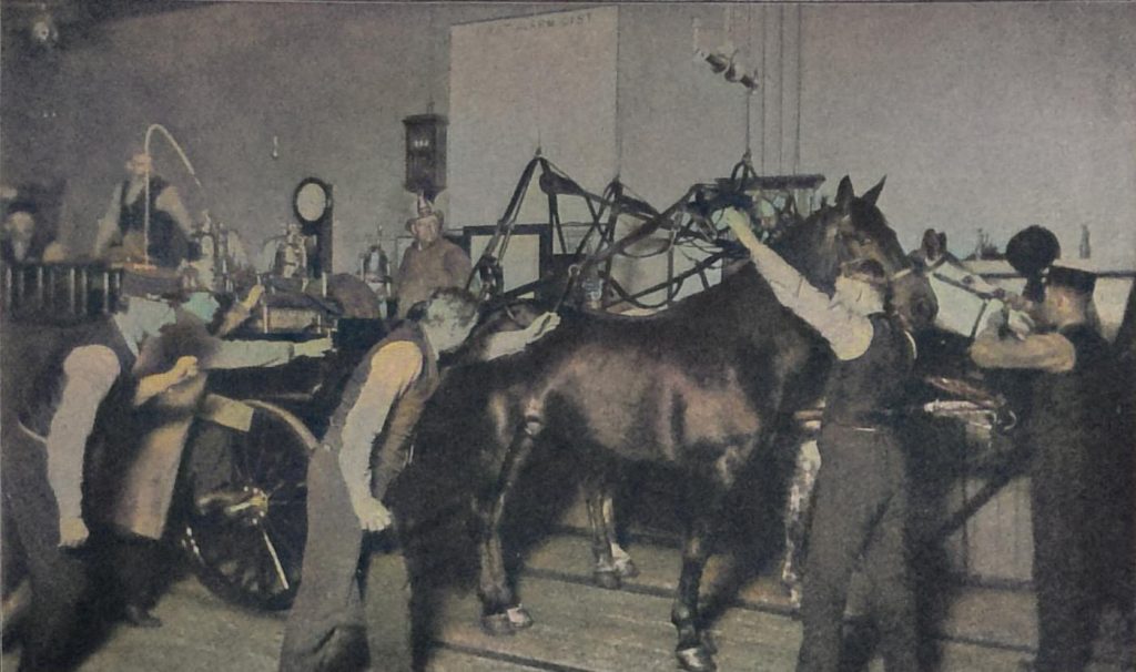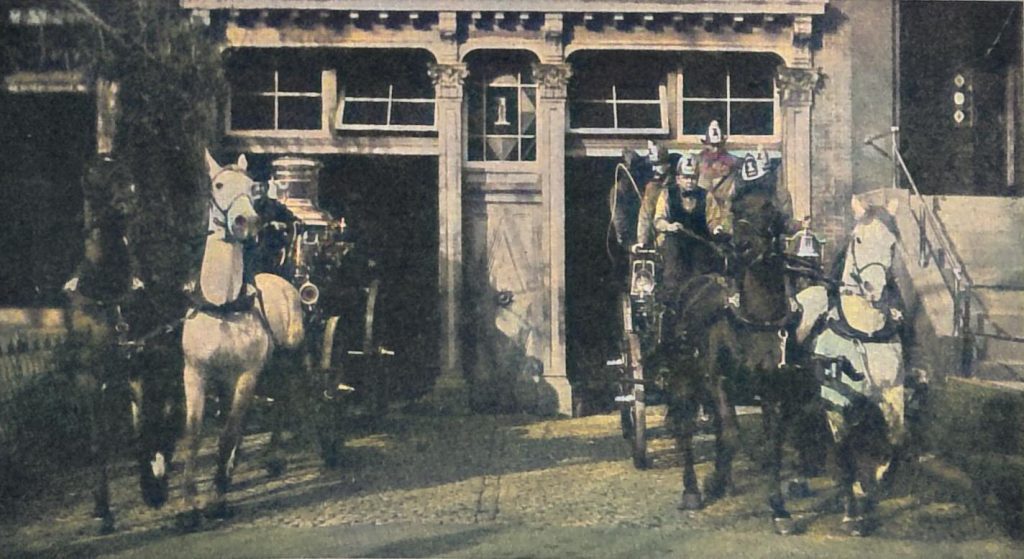 Typisch für die Einrichtungen in den großen Städten Amerikas sind die in Neuyork, die im wesentlichen naturgemäß mit den bei uns bekannten übereinstimmen. Dort wie hier legt man den größten Wert darauf, daß die Rettungsmannschaft möglichst schnell nach Ausbruch des Feuers auf der Brandstätte erscheint. Daher stehen in jedem Depot mindestens zwei Wagen – eine Spritze und ein Schlauchwagen – fertig angeschirrt bereit, um sofort abzufahren, wenn das Alarmsignal gegeben wird. Das Pferdematerial ist vortrefflich, und man rechnet, daß die erste Spritze durchschnittlich zwei bis drei Minuten nach Meldung eines Brandes an Ort und Stelle ist.