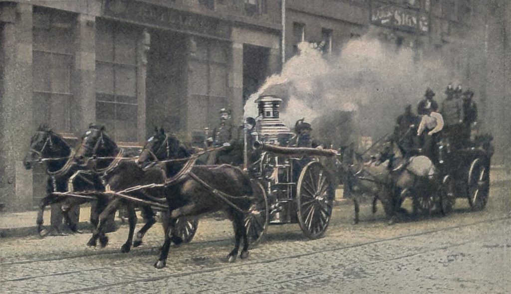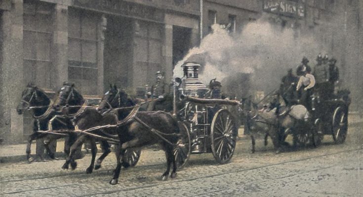 Im übrigen sind alle erdenklichen Vorkehrungen getroffen, damit auch die andern Wagen unnmittelbar hinterher folgen können. Ertönt auf der Straße die Glocke der Feuerwehr, in deren lauten Klang sich das schrille Pfeifen der Dampfspritze mischt, so macht alles Platz.