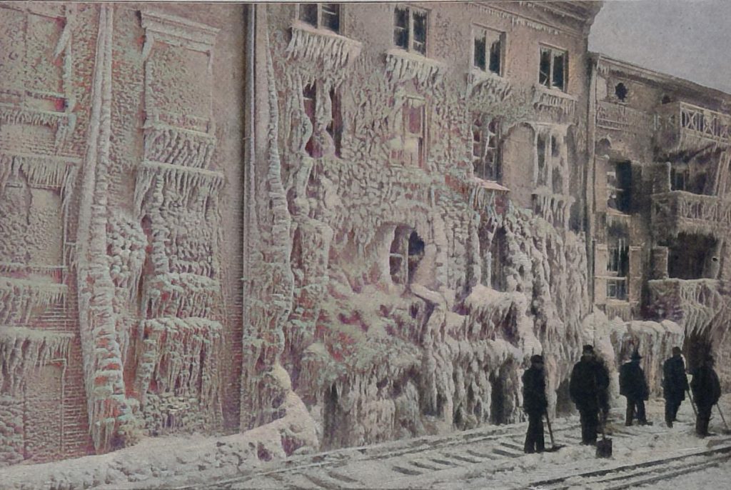 Unser Bild zeigt deutlich die Wirkung der Kälte auf die von der Feuerwehr in Angriff genommenen Häuser; ganz wundersame Gebilde von Eis, wie wir ähnliche nur aus Sandstein oder Tropfstein in den Höhlen unserer Gebirge kennen. Es werden da eben riesige Massen von Wasser auf die Mauern geschleudert, Neuyork hat Spritzen, die bis zu 100 Gallonen in der Minute hergeben.
