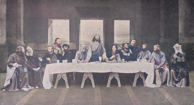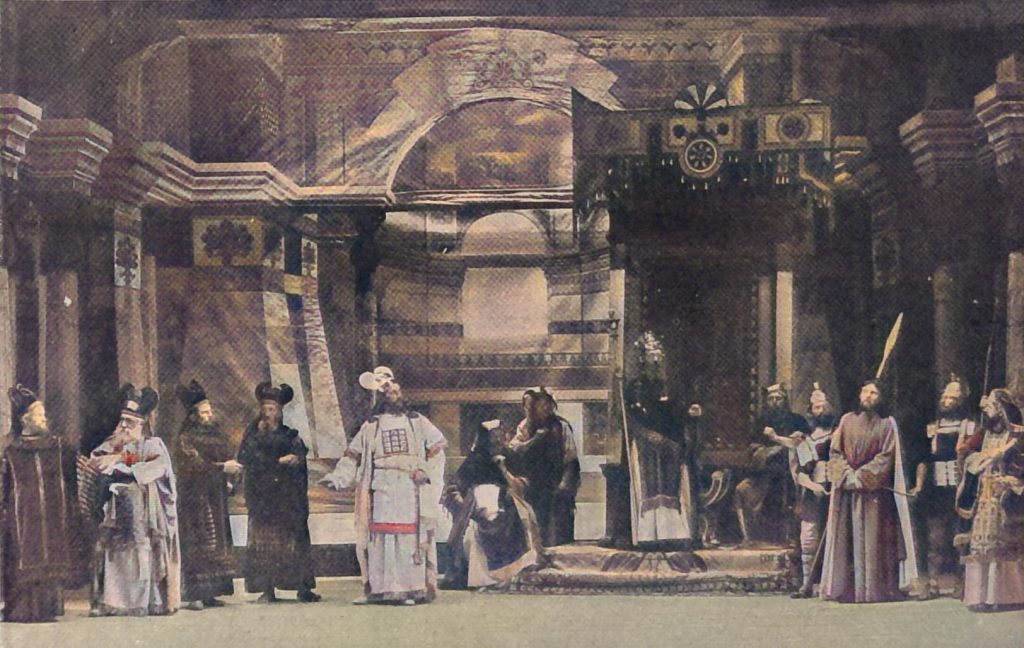 Sind die Aufführungen vorüber, dann kehren die Darsteller zur Werktagsarbeit zurück. Allein die Oberammergauer vergessen nie, daß sie alle zehn Jahre auf dem Platz sein müssen; um nicht aus der Uebung zu kommen und um den Nachwuchs heranzubilden, spielen sie für sich immer Theater und bringen meist religiöse oder vaterländische Volksschauspiele zur Aufführung. Nahen dann die eigentlichen Passionsspiele heran, so tritt ein aus 24 großjährigen Gemeindemitgliedern bestehender Ausschuß zusammen, der in geheimer Wahl bestimmt, welche Personen die einzelnen Rollen übernehmen sollen. Steht die Rollenbesetzung fest, so werden zuerst Leseproben vorgenommen, dann geht es an die Einstudierung, und schließlich kommen die Bühnenproben, die mit größtem Eifer betrieben werden. So ist es auch jetzt wieder geschehen, und der Erfolg war, daß man Bühnenbilder von seltener Abrundung zu schauen bekam. Die übrigens mit großartiger Pracht gestellten Bilder sind ein wesentliches Element der Passionsspiele. Nicht nur daß, wie bereits erwähnt, auf die äußere Erscheinung der Darsteller das größte Gewicht gelegt wird, es geht auch den meisten Scenen der Handlung ein Vorbild vorauf, in dem eine der jeweiligen Phase aus dem Leben Christi einigermaßen entsprechende Episode aus dem alten Testament dargestellt wird; beispielsweise sehen wir vor dem Rat der Hohenpriester die Söhne Jakobs über die Beseitigung ihres Bruders Joseph beschließen oder vor der Verspottung Jesu durch Herodes Samsons Verhöhnung durch die zechenden Philister.