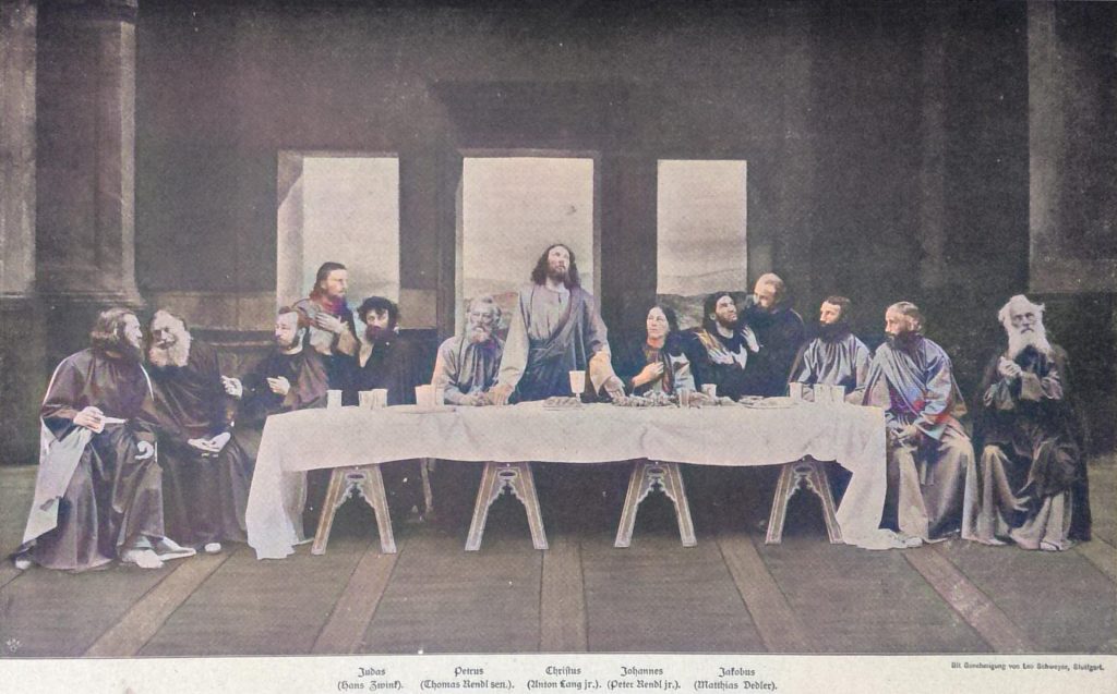 Das Passionsspiel selbst zerfällt in drei Abteilungen; die erste reicht vom Einzug Christi in Jerusalem bis zu seiner Gefangennahme am Oelberg, die zweite umfaßt die folgende Zeit bis zur Verurteilung und die dritte den Schluß bis zur Himmelfahrt. Von ganz besonderer Wirkung waren u. a. die Verspottung des Heilands durch Herodes (Rochus Lang sen.) und später durch die Landsknechte, das heilige Abendmahl, nach dem Gemälde Leonardo da Vincis, Christi Abschied von seiner Mutter Maria (Hafnermeister Anton Lang jr. und Postbotentochter Anna Flunger) die Kreuzigung und die Grablegung.