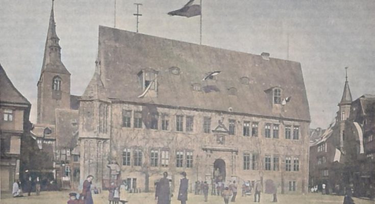 Zumal jetzt, wo das Laub abgefallen ist, gewährt die mit krausem, phantastisch verästeltem Rankenwerk überwucherte Hauptfront in ihrer derben Ausführung aus Sandstein in unregelmässiger Bearbeitung in ihrer altersgrauen Färbung einen eigenartigen alterthümlichen Eindruck. Dazu nun aber die wunderbare Zusammenstimmung mit der ganzen Umgebung! Rechts und links alte charakteristische Fachwerkshäuser, zumtheil bemerkenswerthe Muster niedersächsischer Holzarchitektur, die sich wie Schutz suchend an den trutzigen Massivbau des Rathhauses herandrängen – fast bedenklich nahe, wenn man an eine doch jederzeit mögliche Feuersgefahr denkt!