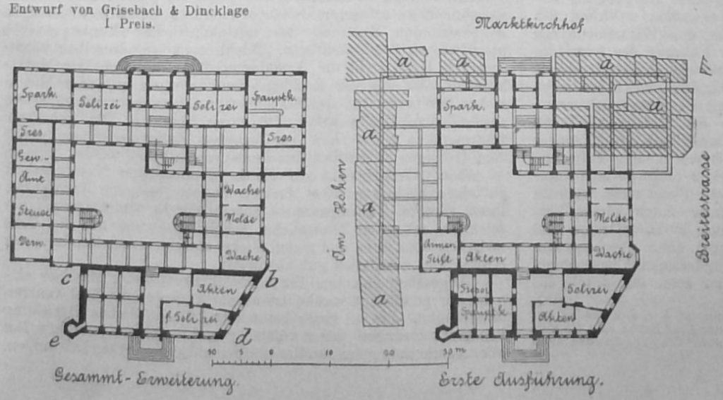 Im Grundrisse der Gesammt-Erweiterung ist b, c, d, e das zu erhaltende alte Rathhaus. Im Grundrisse der ersten Ausführung sind die zum späteren Abbruch bestimmten, vorläuflg jedoch noch nicht angekauften alten Wohnhäuser mit a bezeichnet.
