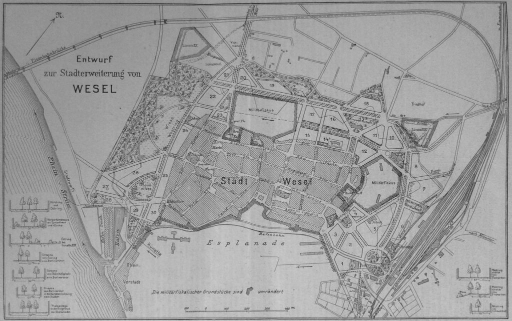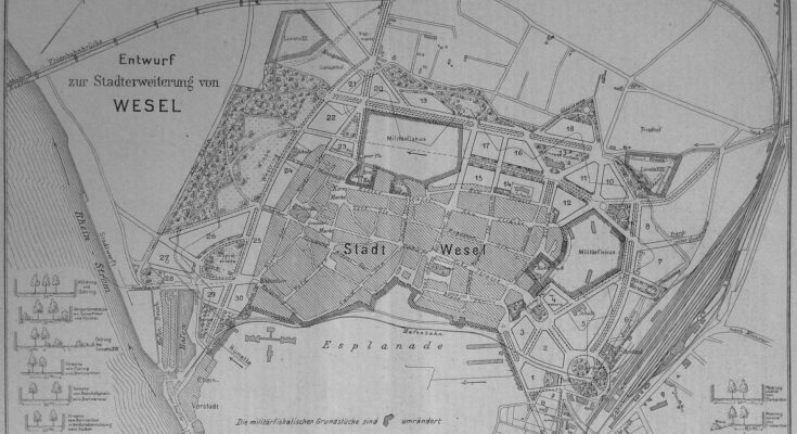 Unter den rheinischen Städten ist die alte, an der Mündung der Lippe in den Rhein gelegene feste Stadt Wesel wohl diejenige, welche durch den engen Ring von Wällen und Gräben am empfindlichsten in der natürlichen Entwickelung gehemmt worden ist. Obwohl zu der günstigen Lage an den beiden Flüssen die Eigenschaft als Knotenpunkt von sechs Eisenbahnstrahlen nach Köln, Münster, Bocholt, Arnheim, Bocholt und Venlo hinzu tritt, vermochten sich der Wohlstand und die Einwohnerzahl der Stadt in den letzten Jahren verhältnissmässig nur wenig zu heben.