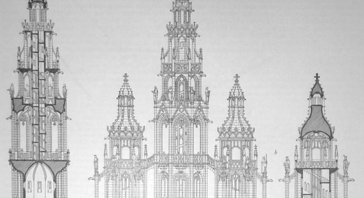 Ferner fällt hiermit die sehr gekünstelte Erklärung des Zwiespaltes zwischen den gleichzeitigen Berichten. Allem Anschein nach hat thatsächlich der Westthurm des Meissner Domes, wie jener des Domes und der Severinkirche zu Erfurt, der Nikolaikirche zu Leipzig, der Stadtkirchen zu Oederan und Mutzschen (und Ansbach in Franken) drei Spitzen gehabt, von welchen die mittlere höher geführt war und die Glocken trug, während ursprünglich, um 1400, zwei Eckthürme beabsichtigt gewesen zu sein scheinen. Ein solches Abweichen von dem ursprünglichen Plane ist bekanntlich eine im Mittelalter sehr häufig zu beobachtende Erscheinung.