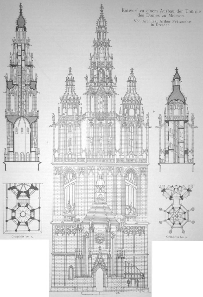 Ein junger Dresdener Architekt, Hr. Arthur Fritzsche, hat sich wiederholt an der Lösung der Thurmbaufrage versucht. Auf meinen Hinweis ist auch er zu der Ueberzeugung gelangt, dass eine dreifache Spitze und dass der Renaissance sich bereits nähernde Formen der spätesten Gothik der Anlage den besten Abschluss geben würden In den Abbildungen erlaube ich mir, seinen geschickten Entwurf als Beitrag zu der Frage vorzulegen.