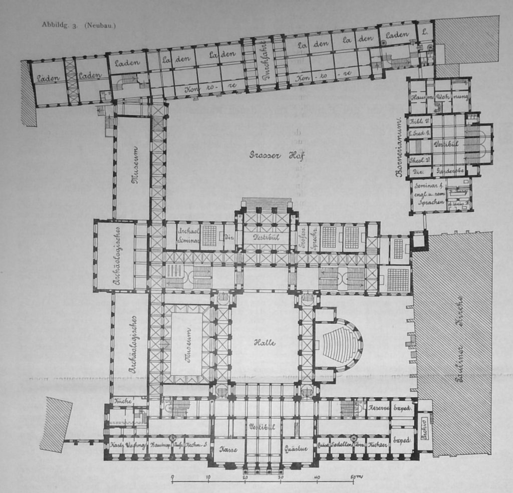 Als im Jahre 1890 die Räume der ehemaligen Universitäts-Bibliothek verfügbar geworden waren, trat an den Universitäts-Senat die Frage heran, wie die Ausnutzung des Platzes nunmehr zu bewerkstelligen sein werde. Der damalige Rektor, Hr. Prof. C. Binding, verstand es mit einer ausserordentlichen lebenssprühenden Energie, nicht nur den Architekten für seine weitgehenden Pläne zu begeistern und zur schnellsten Anfertigung einiger grundlegenden Skizzen anzuregen, sondern auch Universitäts-Behörde und Regierung wusste er für den Vorschlag eines vollständigen Umbaues bezw. Neubaues zu erwärmen, so dass die Landstände von der Nothwendigkeit sich überzeugen mussten und die grossen Mittel dem warm befürwortenden Minister v. Gerber bewilligten.