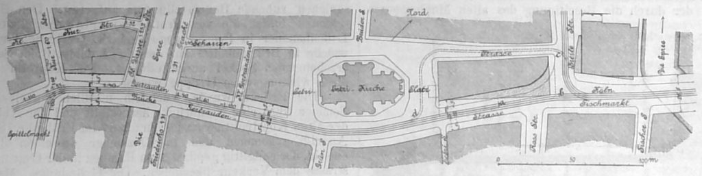 Zwischen Brücke und Petri-Platz einerseits und diesem Platz sowie dem Köllnischen Fischmarkt andererseits sollte diese Breite durch entsprechende Zurückschiebung der nördlichen Bauflucht, zwischen Brücke und Spittelmarkt durch Zurückschiebung beider Baufluchten erzielt werden.