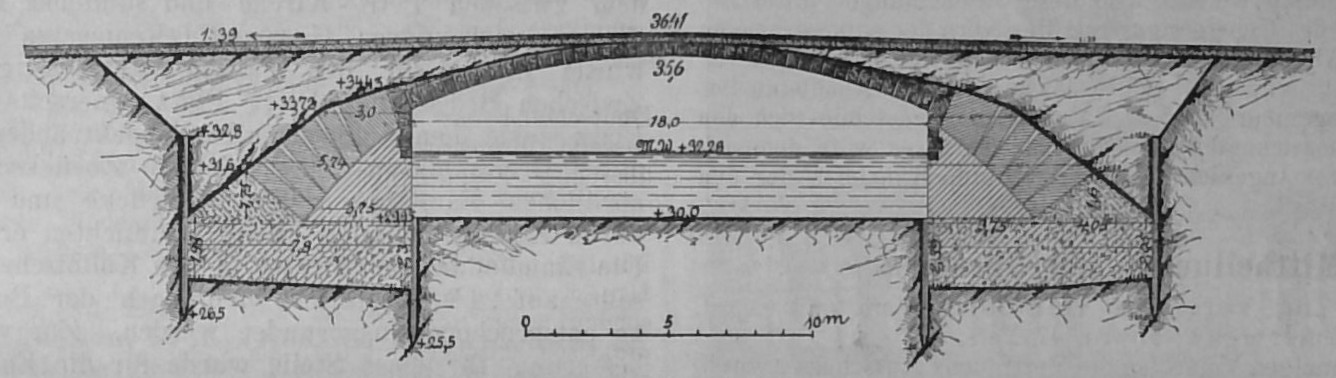Als Belastung des Lehrgerüstes für das in Basaltlava hergestellte, im Scheitel 0,50, am Kämpfer 0,70 m starke Gewölbe wurden einschl. Eigengewicht 3 t für 1 cbm Gewölbemauerwerk gerechnet, während 1000 kg für 1 qm als Beanspruchung zugelassen waren. Eine Verankerung der Kragträger am Widerlager war nicht erforderlich, da die Einwölbung gleichmässig von den Widerlagern her erfolgte und infolge dessen bis zum Schlusse stets das nöthige Uebergewicht nach den Kämpfern zu vorhanden war. Eine vorherige Belastung des fertigen Gerüstes wurde nicht vorgenommen. Um nun aber in dem sich stetig bis zum Schlusse bewegenden Gewölbe Risse zu vermeiden, wurden die Quader auf dem um 4 cm überhöhten Lehrgerüst mit Keilen vollständig trocken versetzt. Die unten 1 cm weiten, nach oben sich z. Th. aber erheblich verbreiternden Fugen wurden dann sorgfältig mit Werg gedichtet und nach Schluss des Gewölbes hintereinander mit Zementmörtel 1:1 vergossen. Die unteren Gewölbschichten mussten dabei auch auf der Rückenfläche abgedichtet werden, um ein Austreten des Mörtels zu verhindern. 8 Tage nach dem Vergiessen wurde ausgerüstet. Das Gewölbe zeigte dabei keine nachweislichen Bewegungen mehr, während sich das Gerüst während des Einwölbens nahezu um die 4 cm Ueberhöhung gesenkt hatte.
