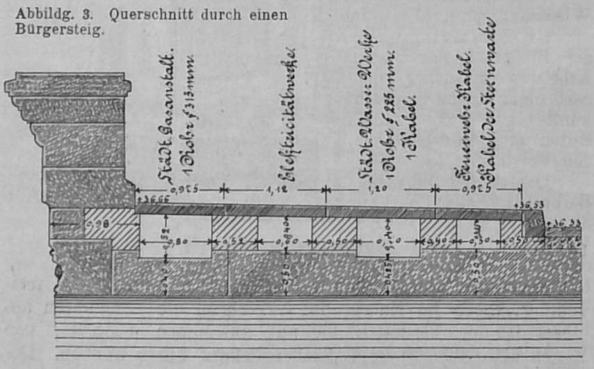 Von diesen Gesammtmaassen entfallen 12 m auf den Damm und je 5 m auf die beiderseitigen Bürgersteige. Die in dem Entwurfe vorgesehenen neuen Baufluchten wurden durch Kabinets-Ordre vom 16. Dezember 1891 genehmigt und festgesetzt.