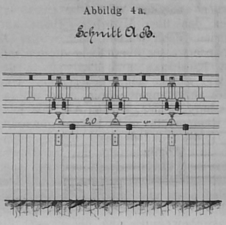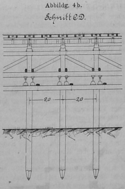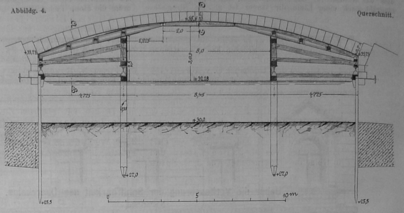 Die Enden der Kragarme und die Längsträger sind auf das für die Herstellung solider Anschlüsse erforderliche Maass von 14 cm Höhe beschränkt worden, sodass hier einschl. der 1 cm starken oberen Gelenkplatte und des 5 cm starken Bohlbelags imganzen 20 cm Konstruktionshöhe erforderlich wurden. Da die Bogenleibung in 2 m Abstand von der Brückenmitte noch 3,23 m Ordinatenhöhe besitzt, so ergab sich die schon genannte Lichthöhe von 3,03 m auf 4 m Breite. An der Stützenreihe war das Maass von 2,5 m festgehalten worden.