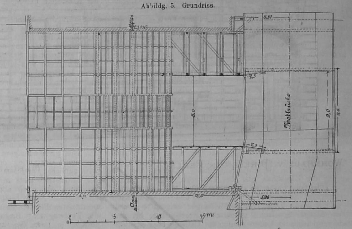 Das Lehrgerüst, bei dem wohl zum ersten Male das Prinzip des Kragträgers zu Anwendung gekommen ist, wurde von dem unterzeichneten, bauleitenden Stadtbaumeister in Gemeinschaft mit Reg.-Bauführer Th. Zoche konstruirt. Das Gewicht der Eisenkonstruktion einschl. der gusseisernen Lager und der Befestigungsbolzen auf der Holzkonstruktion belief sich auf 34,6 t, welche für 210 M. für 1 t von Mehlis & Behrens, Cyklop, geliefert und aufgestellt wurden. Die Gesammtkosten des Eisens einschl. Montage betrugen somit 7263 M. Für Herstellung, Vorhaltung und Wiederbeseitigung des hölzernen Unterbaues einschl. einer zum Schutze des Lehrgerüstes oberhalb hergestellten kräftigen Lehre mit Abweiseböcken, sowie für Abnahme und Abfuhr der Eisenkonstruktion nach einem städtischen Depotplatz wurden 6367 M. bezahlt.