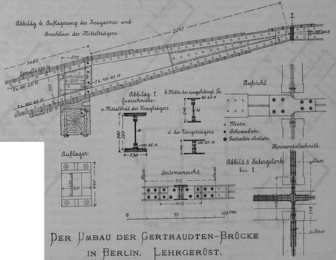 Die Eisenkonstruktion ist inzwischen mit einigen Abänderungen schon wieder verwendet worden und zwar bei der Einwölbung der Mittelöffnung der Oberbaumbrücke. Sie soll demnächst bei der Ausführung der Schöneberger Brücke zum dritten Male benutzt werden und wird sich später bei allen anderen, noch auszuführenden Brücken über den Kanälen als brauchbar erweisen, sodass also mit der Verwendung dieser eisernen Träger neben der erzielten grösseren Lichthöhe während (des Umbaues und dem damit für die Schiffahrt verbundenen Vortheile auch in wirthschaftlicher Beziehung das Ergebniss ein günstiges sein wird.