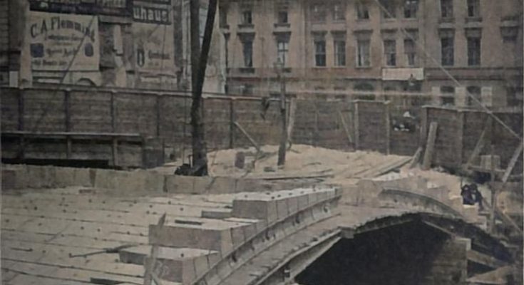 Bemerkt sei noch, dass die Versetzung der bis zu ¾ t schweren Kämpfersteine und Gewölbquader ohne jedes Versetzgerüst nur mittels zweier hinter den Widerlagern aufgestellter Mastenkrahne, vergl. das Kopfbild dieser Nummer, bewirkt wurde. Es sind mit 1 Krahn an einem Tage bis zu 40 Quader versetzt worden, sodass die Arbeit rasch gefördert wurde. Vom Anfang der Aufbringung der Mitteltheile des Lehrgerüstes bis zur Ausrüstung des Gewölbes waren imganzen 38 Tage erforderlich. Die Beseitigung des mittleren Lehrgerüsttheiles erfolgte in einer Nacht auf einfache Weise, indem ein Kahn mit leichter Holzrüstung in die Durchfahrt geschoben wurde, auf den man dann die ganze Konstruktion herabliess.
