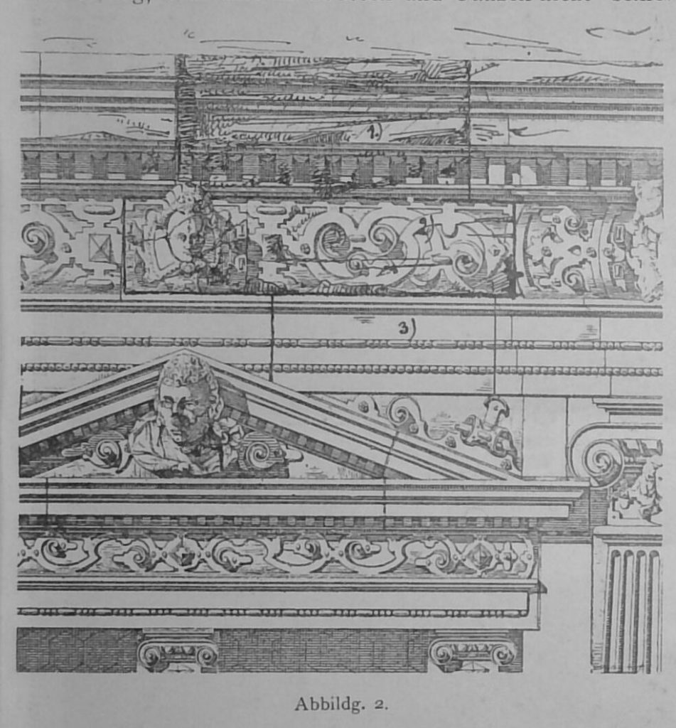 Der Verfasser ist der Meinung, dass dies im Grossen und Ganzen nicht zutrifft. Schäfer musste den Bau in einen solchen Zustand versetzen, dass die noch unbeschädigten Theile der Fassade den Fährlichkeiten der Witterung, welche durch benachbarte beschädigte Steine hervorgerufen oder doch vergrössert wurden, nicht mehr unterlagen; er musste alle Architekturglieder neu ersetzen, die nicht mehr am gesunden Stein (durch Führungen u. dergl.) ergänzt werden konnten, oder er durfte entsprechend dem 1891er Kommissions-Beschluss nur die gänzlich zerstörten Steine ersetzen. So wie er es machte, haben wir jetzt nur gesunde Steine, neue und alte, im anderen Falle hätten wir gesunde neue und mehr oder minder zerstörte alte Steine an den Fassaden. Die Erneuerung hätte alsbald wieder zu beginnen und hörte nie auf, Wir wollen versuchen dies an einem Beispiel noch deutlicher zu machen. In Abbildung 2 sei 1. ein zu dreiviertel und 2. ein zur Hälfte zerstörtes Gurt- bezw. Friesstück, während 3. ein noch ganz gesundes Architravstück sei. Hätte man nun 1. belassen bis zur vollständigen Zerstörung, so wäre bei seinem Neuersatz 2. bis zu 3/4 zerstört gewesen, bei 3. aber hätte wegen der inzwischen sehr ungünstigen Schutzformen von 1. und 2. die Verwitterung bereits begonnen. Nach wenigen Jahren wären auch 2. und 3. zum Ersatz reif gewesen. Man hätte also in einer Anzahl von Jahren 3 neue Steinstücke. Schäfer hat nun 1, und 2. alsbald ersetzt; 1. war verloren, 2. dagegen konnte in halb verwittertem Zustand herausgenommen und aufbewahrt werden. 3. wurde der gefährlichen Nachbarschaft entzogen und ist so gut wie ein neuer Stein. So haben wir jetzt zwei neue und einen gesunden alten Stein und ausserdem einen halb verwitterten Stein an sicherem Ort. Dieses Rechenexempel spricht doch eine klare Sprache gegenüber den Ruinenfreunden; der Verlust ist auf ihrer Seite. Ganz ähnlich, in mannichfaltiger Abwechselung, liegen die Verhältnisse am Otto-Heinrichs-Bau.