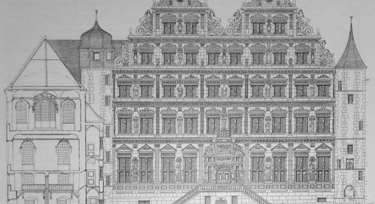 Die weitere Behauptung, die Architektur der Fassade des Otto Heinrichs-Baues stehe mit der oberitalienischen Renaissance in unmittelbarem Zusammenhange, und zwar, wie die Historiker wollen, in dem Sinne, dass dadurch der horizontale Abschluss bedingt sei ist durchaus unrichtig. Es weiss jeder, dass die deutsche Renaissance in ähnlicher Beziehung zu der italienischen Renaissance steht, wie diese zur römischen Antike.