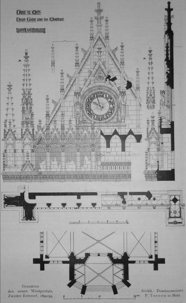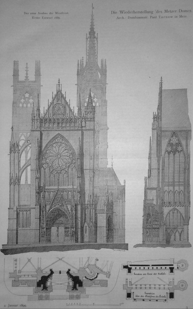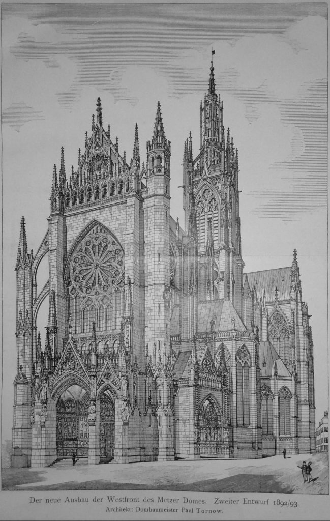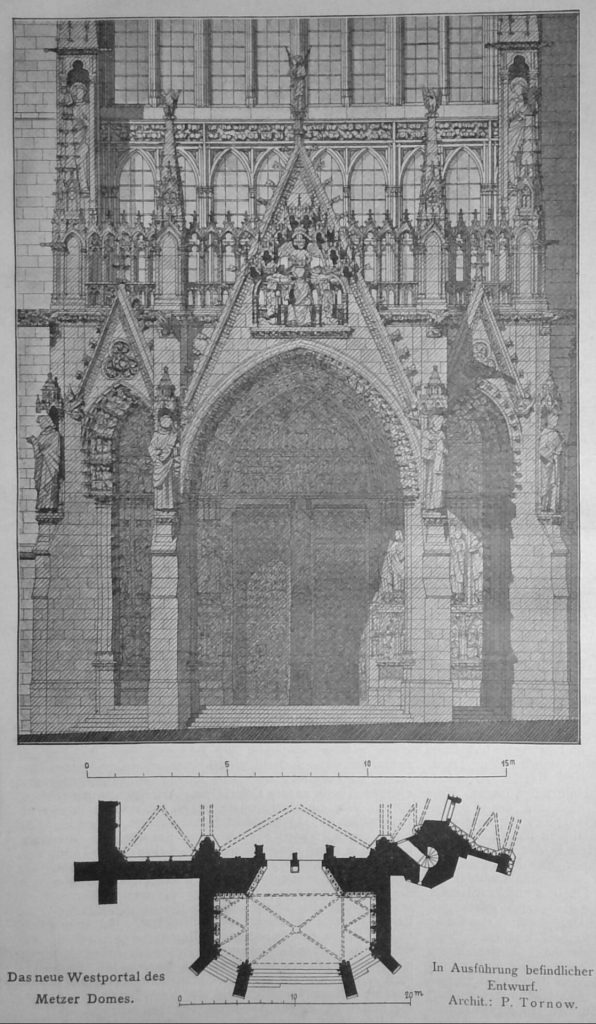 Neben der vorläufig noch vertagten Errichtung des zur Bekrönung des Baues bestimmten Dachreiters über der Vierung, welcher – wie in Paris und Amiens – als Ersatz eines die Anlage beherrschenden Hauptthurmes dienen soll, ist die zurzeit in Ausführung begriffene Neugestaltung der Westfront weitaus die wichtigste der zur Wiederherstellung und Vollendung des Metzer Domes erforderlichen Arbeiten. Denn sie soll die äussere Erscheinung desselben nicht nur zum harmonischen Abschluss bringen, sondern ihr geradezu das entscheidende Gepräge verleihen. Man darf sich daher nicht wundern, wenn Meister Tornow es mit dem Entwurfe zu dieser künstlerischen Schöpfung, die vermuthlich das Hauptwerk seines Lebens bleiben wird, ganz besonders ernst genommen und unermüdlich verschiedene Lösungen versucht hat, bis er endlich überzeugt war, das Rechte gefunden zu haben.