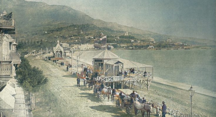 Es wird dort ja so früh Herbst. Und die Winde wehen kalt, und die nördliche Sonne, die nicht durchdringen will, kämpft vergebliche Kämpfe mit den giftigen Nebeln aus den Petersburger Sümpfen. Schon Mitte September dürfen die kleinen reizenden Prinzeßlein, der liebliche Nachwuchs der Zarenfamilie, nicht mehr spazieren gehen und bekommen zu den Ausfahrten dicke weiße Mäntelchen an. Hu – naß, kalt und langweilig! Aber unten im Süden, am wogenden, in bunter Schönheit leuchtenden Südufer der Krim, wo das Wasser des Schwarzen Meers in zarter Bläue schimmert und stolze Paläste, in reiche, sonnige Pracht gebettet, Weinberge und Gärten voll tropischen Ueberflusses spiegelt, da wird es schön um diese Zeit. Dahin kommt der Herbst nicht als grauser Mörder, sondern als stiller Freund, der mit zärtlichen Händen die allzugroßen Gluten des Sommerbrands kühlt und freundlichen Gesichts neue duftende Lebenswonnen schenkt. Da ist es nun gut sein, und das frohe Zarenschloß Livadia im Schutz der Höhen über Jalta hat die seligsten Härten, den süßesten Reichtum an Früchten, wie sie der Süden reift, und die herrlichsten Fernblicke. Aber auch die Großen des Reichs, die mit ihrem Zaren aus dem häßlichen, traurigen Petersburg geflohen, haben es gut hier, wo die Erde im Frieden der Schönheit, Sonnensatt und überreich Feierabend macht. Leis nur und zärtlich kost sie mit den weichen Fluten des Meers und läßt sich in stiller Hoheit vom milden Himmel mit Festgewändern und selten strahlenden Farben schmücken. Feierabend. Und die Menschen leben ein Leben der Freude. Auch die vornehmsten Excellenzen lassen Vornehmheit und Steifigkeit fahren. Weite Spaziergänge durch das sonnige Gelände, lustige Ritte über die Berge, frische Bäder in früher Morgenstunde, muntere Ausfahrten zu entfernteren Klöstern, wo die Mönche die wunderbare russische Gastlichkeit neben noch weit wunderbareren Weinen pflegen, wechseln mit Jagdausflügen, wobei dann der tartarische Begleiter oft mehr als eine der horngeschmückten Bergziegen zu schleppen bekommt. Der Verkehr ist leicht und lustig. Die offiziellen five o’clock-teas dehnen sich oft bis in die späten Abendstunden aus. Sie brauchen ja nicht offtziell zu sein. Auch die Gedanken brauchen es nicht, und der alte Hofmann Fürst Lieven hat seine besten Bonmots in Jalta ersonnen. O, ein Dorado der Erholung!