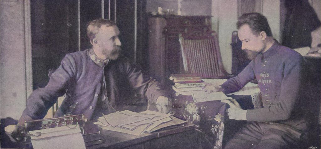 Ein anderer von den Offizieren betete laut, die Hände auf dem Rücken, die Augen geschlossen. Die Gemeinde sang ein Lied aus dem „Kriegsruf“. Uebrigens war ich erstaunt, wie wenige mit einstimmten. Dann das Solo eines jungen Kapitäns, der von den Hallelujamädchen fast so angeschwärmt zu werden schien wie ein neuer Tenor von den Damen des Berliner Westens.