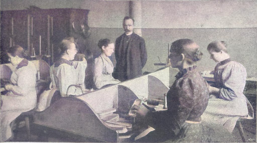 Im Frauenheim der Blindenanstalt – Blinde Arbeiterinnen beim Bürstenbinden