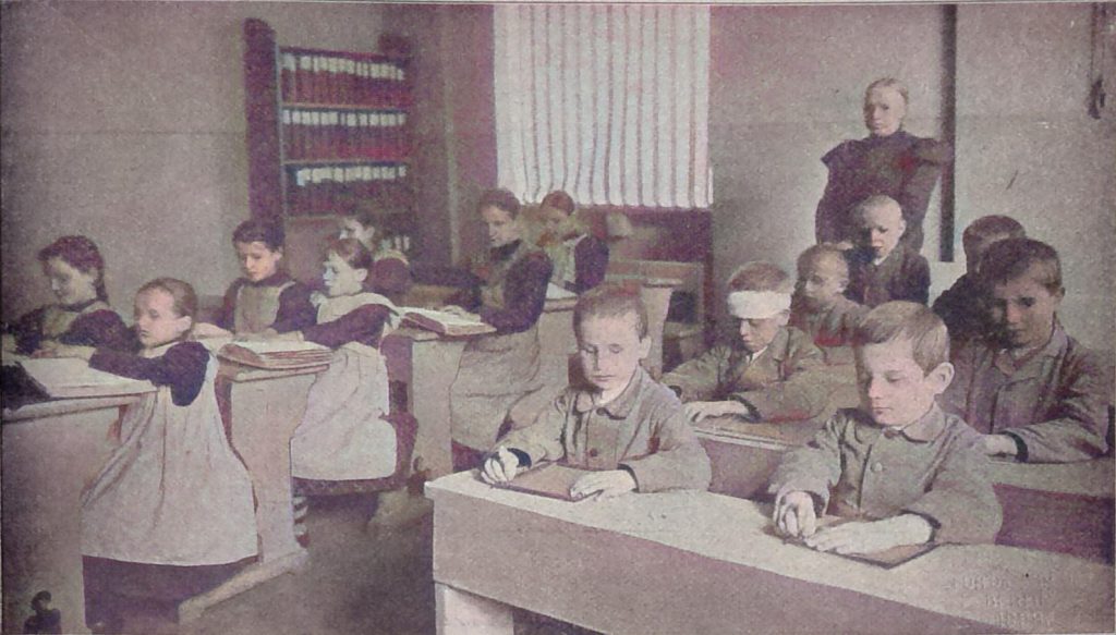 Im Unterrichtszimmer der Blindenanstalt – Uebungen der Kinder in der tastbaren Punktschrift