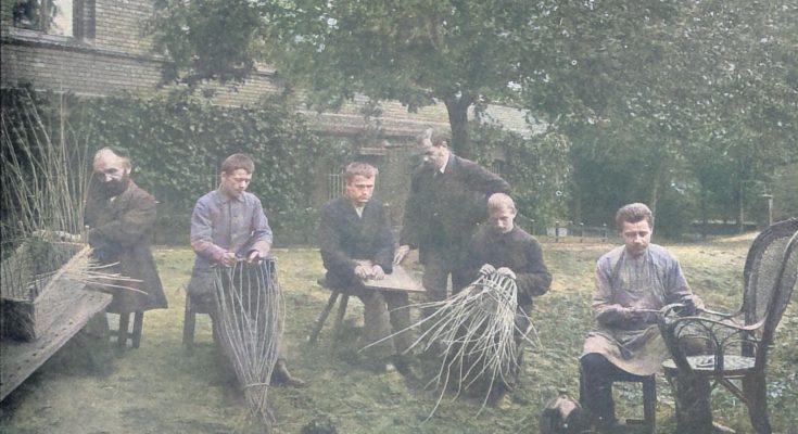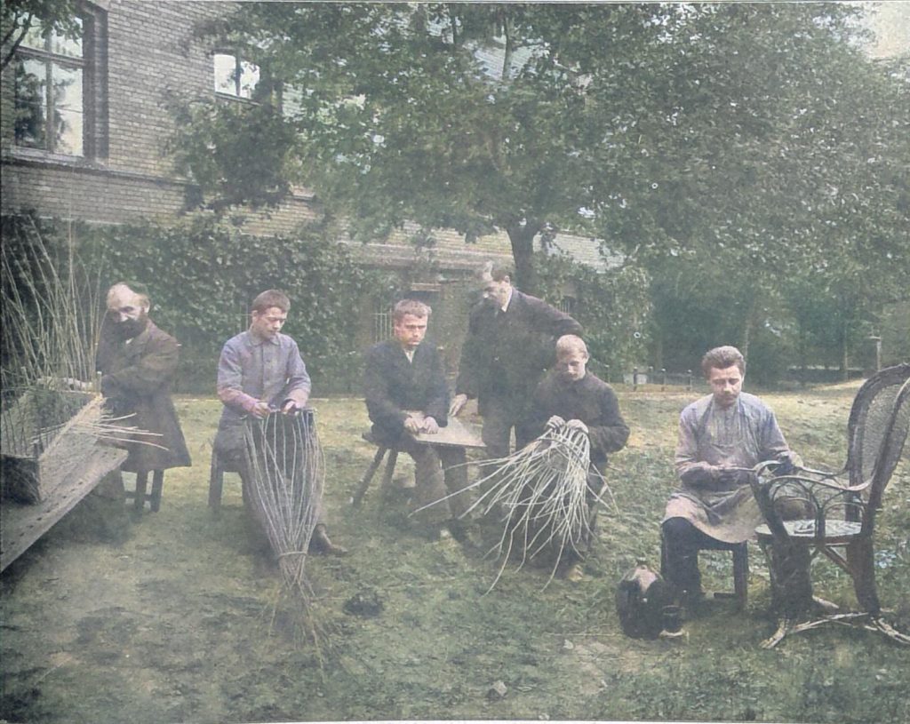 In den Gartenanlagen der Blindenanstalt – Blinde Handwerker beim Korbflechten