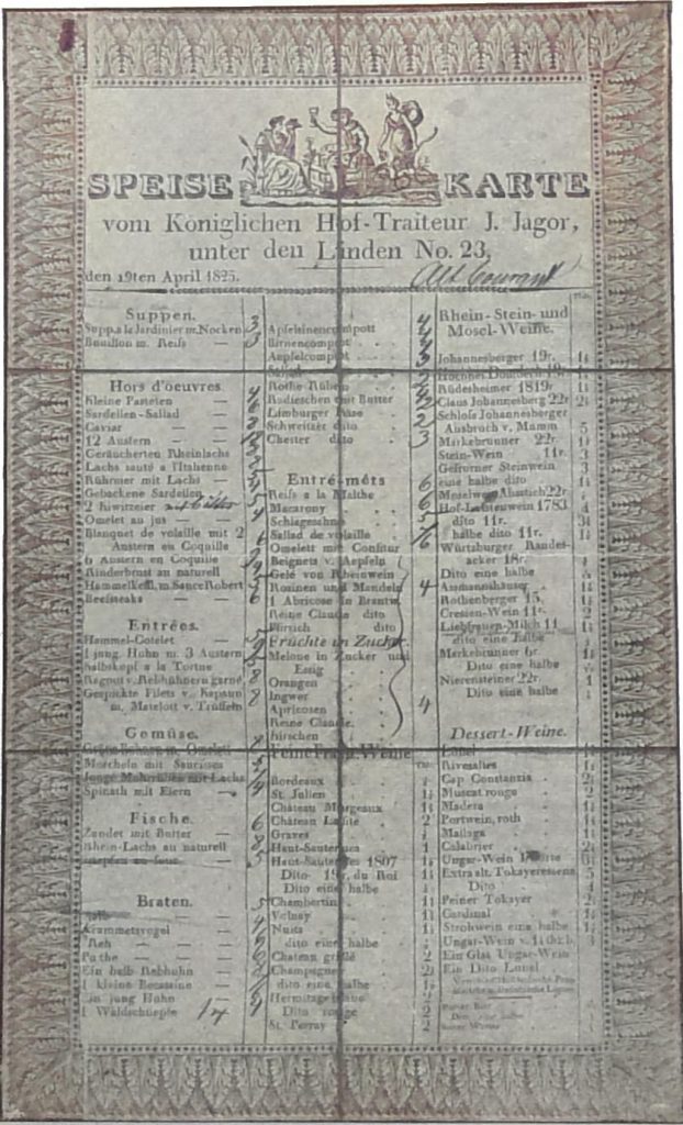 Berlin hatte 1825 etwa 250 000 Einwohner, war also immerhin schon eine große Stadt und dazu Residenzstadt, der es nicht an Gourmets gefehlt haben wird, die zu Jagor gingen, um fein zu essen. Diese Speise- und Weinkarte aber ist interessant in mehr als einer Hinsicht. Zunächst ist ihr das Datum des Tages bereits aufgedruckt, und zwar das des 19. April 1825. Die Preise aber sind berechnet in Alt Courant, das heißt in Thalern und guten Groschen. Vier Gute waren gleich fünf Silbergroschen, also war ein Guter Groschen so viel wie 12 ½ Pfennig nach heutigem Geld.