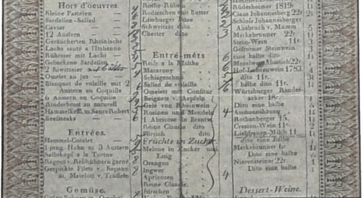 Ich komme zu den Rhein-, Mosel- und Steinweinen. Weit mehr hier noch als bei den französischen macht es sich geltend, daß ein andersdenkendes Geschlecht von Zechern aufgekommen. Jetzt kann man sich keine Weinkarte denken ohne eine lange Reihe von Mosel- und Saarweinen, auf dieser alten Jagorschen Karte aber kommt unter zwanzig deutschen Weinen nur ein einziger Moselwein vor, und zwar ohne besonderen Namen als „22er Mosel-Abstich“ zu ½ Thlr. die Flasche. Der Moselwein war sozusagen noch nicht entdeckt worden. Wenn man übrigens auf dieser Weinkarte noch vier Elfern begegnet, zwei Rheinweinen darunter, einem Steinwein und einem Leistenwein, dann wird einem ganz wehmütig zu Mut, und das Wasser läuft einem im Mund zusammen. O daß man nicht damals schon gelebt hat! Das steht jedoch felsenfest, daß etwas so Gutes wie in dem großen Kometenjahr 1811 nachher nicht wieder gewachsen ist. Es giebt noch Elfer. Vor kurzer Zeit fand in Berlin eine Versteigerung Wilhelmischer Flaschenweine statt, zu denen auch 60 Flaschen Rüdesheimer von 1811 aus den Kellereien Napoleons I. gehörten. Von diesem Wein habe ich vor ein paar Jahren noch getrunken, fand ihn aber doch schon zu sehr gealtert. Dagegen muß er 1825 noch von vortrefflichem Geschmack gewesen sein. Es ist auf der Jagorschen Weinkarte ein noch älterer Wein als der Elfer nämlich ein Hof-Leistenwein von 1785, zu finden, der wohl damals mehr seiner Seltenheit als seines guten Geschmack wegen geschätzt worden ist. Die Preise der deutschen Weine steigen bei Jagor bis zu 5 Thlr. für die Flasche und sind im allgemeinen mäßig. Für 93er Rheingauer Weine aus guten Tagen wird jetzt mehr als noch einmal so viel, als damals der teuerste Wein kostete, bezahlt.