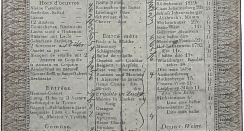 Eine Berliner Speise- und Weinkarte aus dem Jahr 1825 wird in diesem Artikel von 1902 beschrieben.