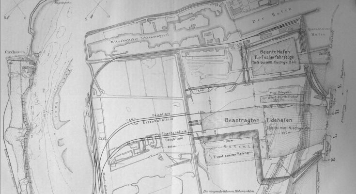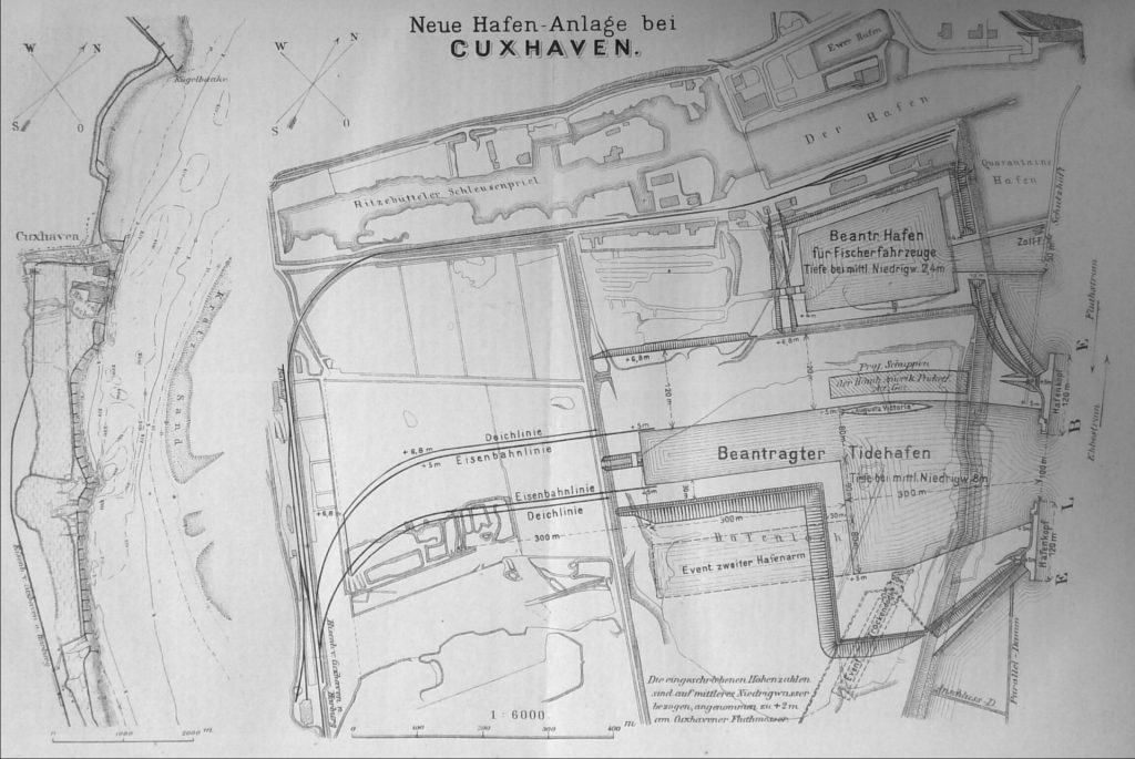 Vor 18 Jahren bildete sich auch eine Gesellschaft zu dem Zweck und gleichzeitig zum Bau der schon lange schmerzlich entbehrten Eisenbahn von Harburg nach Cuxhaven. In Bezug auf den Bau des Hafens aber blieb es bei einem schwachen Versuch und die ertheilte Konzesssion wurde schliesslich im Jahre 1883 wieder zurück gezogen.