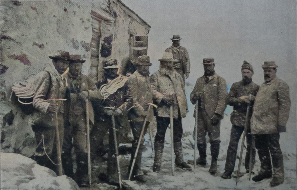 Ingenieure und Führer bei der Festlegung der Linie der Jungfraubahn vor der Konkordiahütte