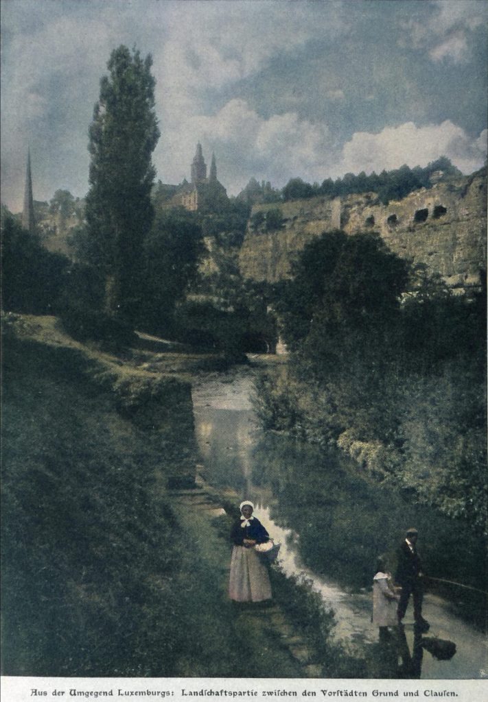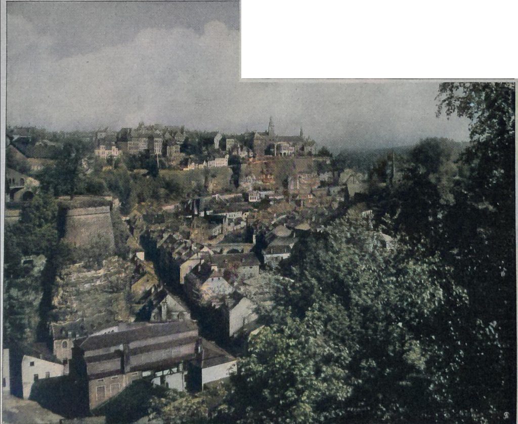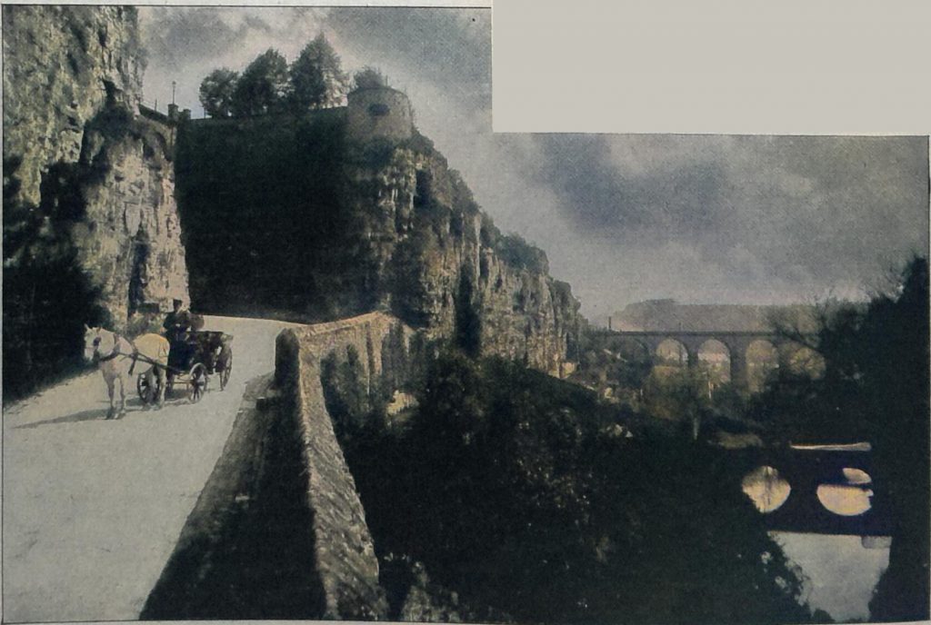 Auf deren jetzt zu den schönsten Promenaden umgewandelten Wällen zu stehen und von schwindelnder Höhe hinabzuschauen in diese weiten, wildzerklüfteten Täler voll Fruchtbarkeit des Bodens und industrieller Regsamkeit, auf die tief unten liegenden, wie einer Spielzeugschachtel entnommenen schieferbedeckten Häuschen, in denen ein emsig tätiges Wirken und Schaffen herrscht, dann dem silbernen Schlängeln der sprudelnden Alzette zu folgen, die hier unter dräuenden Felsmassen verschwindet, um plötzlich voll lächelnden Uebermuts jenseits von ihnen wieder aufzutauchen – dies ist wahrlich ein Bild, wie man es nicht häufig auf unserer schönen Gotteserde wiederfindet. Erhebt man aber den Blick immer höher und höher, bleibt er überrascht und wie gebannt hängen an den altersgrauen, trotzigen Türmchen und Bastionen, die uns inmitten einer rastlos vorwärtsstrebenden Gegenwart von einer großen geschichtlichen Vergangenheit des luxemburgischen Landes erzählen.