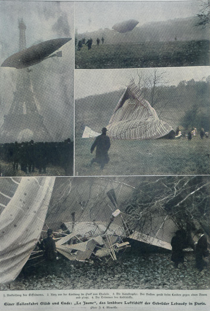 „Le Jaune“, das lenkbare Luftschiff der Gebrüder Lebaudy in Paris. Diese Fotoserie erschien 1903 in der Zeitschift „Die Woche“. Die Fotos stammen von I. E. Meurisse. Alle Bilder wurden nachcoloriert.