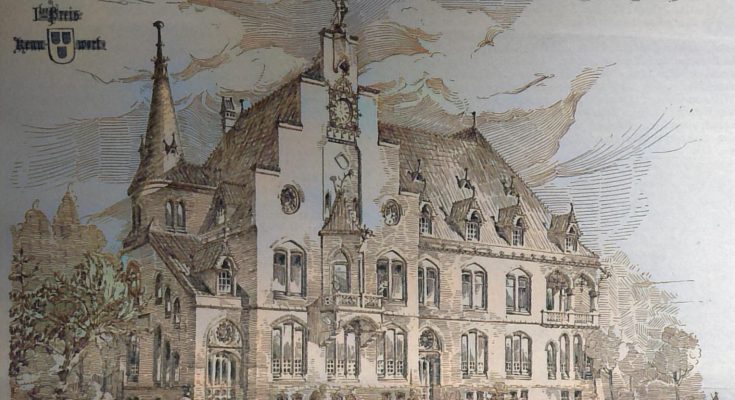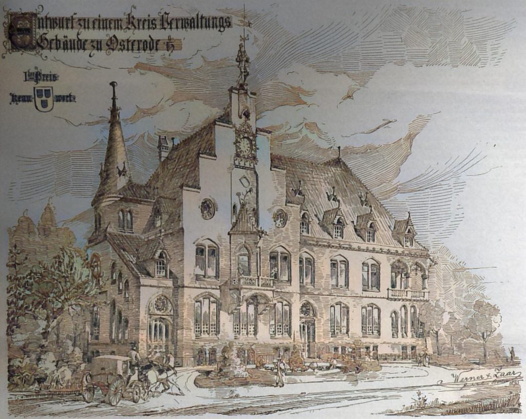 Der in den beistehenden Abbildungen dargestellte Entwurf hat s. Z. bei der für den bezgl. Zweck veranstalteten Wettbewerbung den ersten Preis erhalten, ist von der Prüfungs-Kommission einstimmig der Kreisvertretung zur Ausführung empfohlen und von letzter in ihrer Sitzung vom 12. April d. J. unter Erhöhung der ursprünglich auf 80 000 M. festgesetzten Bausumme auf 100 000 M. zur Ausführung angenommen worden.