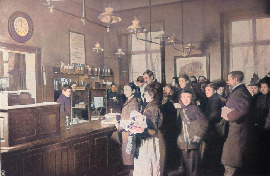 Repräsentation, Technik und das Kommerzielle überließ er also, so weit wie irgend möglich, seinem Direktorium. Ein Gebiet indessen behielt er seiner ganz speziellen Aufsicht vor, nämlich das Wohlfahrtswesen. Hier zu organisieren, hier thätig zu sein, war etwas, was ihm lag da er durchaus kein unbedeutender Kopf war, da ihm unbegrenzte Mittel zur Verfügung standen, hat er auf Gebiet sehr Erhebliches zuwege gebracht. Der Verwirklichung seiner Ideen hoffte er auch zu dienen, indem er ein Reichtagsmandat annahm. Was Krupp als Philanthrop gewesen, ist in Wort und Bild an dieser Stelle wiederholt dargethan worden. Auch heute geben wir die Ansicht einer der ihm geschaffenen Arbeiterkolonien. Ein zweites Bild führt an die Ausgabestelle der – übrigens durchaus liberal verwalteten – Bibliothek für Angestellte und Arbeiter der Essen Gußstahlfabrik. Man sagt immer, daß nur Leute, die selbst nichts besitzen, freigebig seien. Krupps Handeln war unter den nicht seltenen Beispielen für die Unrichtigkeit dieser Ansicht besonders beweiskräftig.