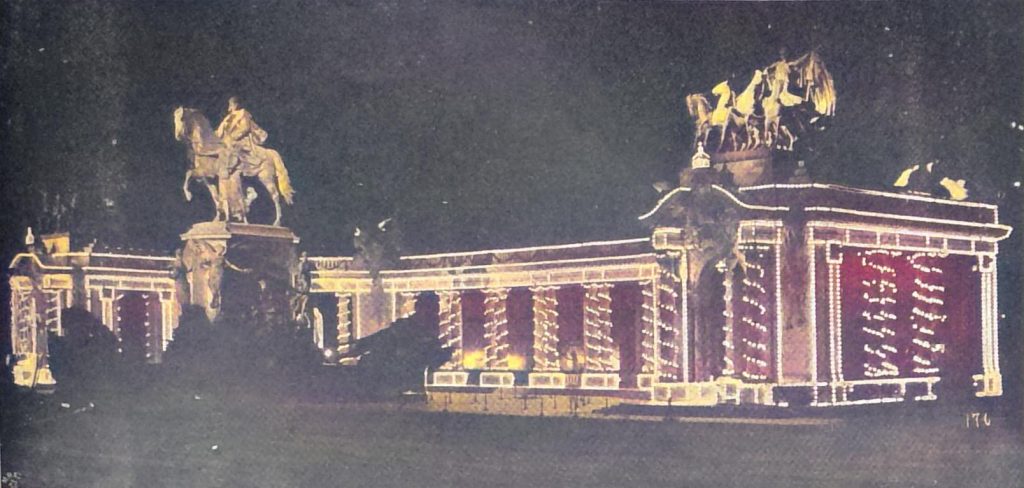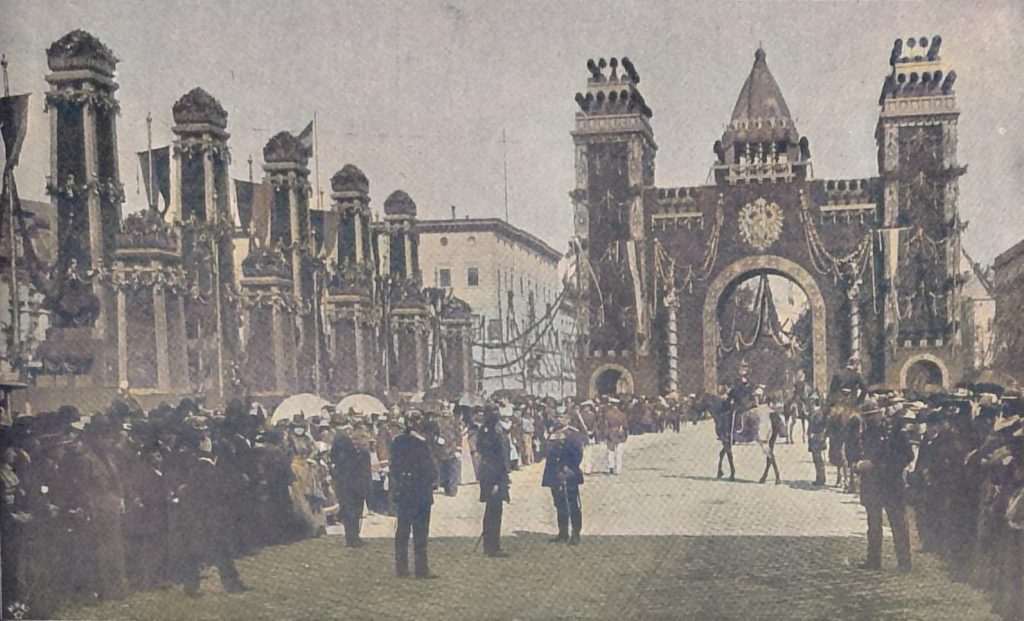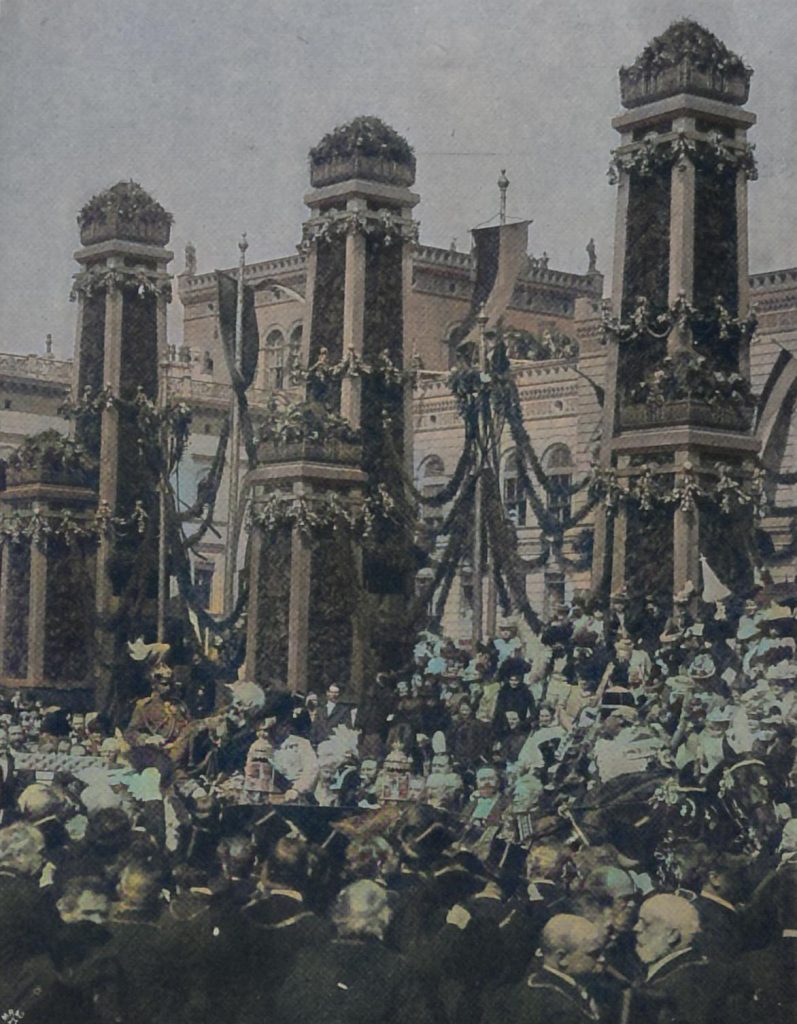Die wuchtigen, im Schimmer von Gold, Laubgewinde und Blumen aufragenden Obelisken, der monumentale Bogen der Ehrenpforte mit feinem herrlichen Baldachin, dem weit ausladenden österreichischen Doppeladler und der zierlichen Zinne, von der herab die Fanfaren klangen, die wallenden Fahnen Oesterreichs und Ungarns und die mit den schönen Frauen und Mädchen Berlins gefüllten Tribünen.