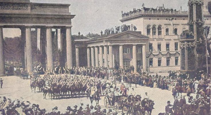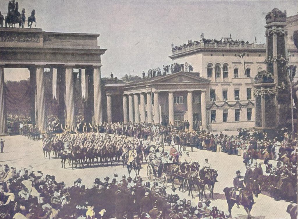 Und nun kam die Stadt Berlin mit ihren Einwohnern und Gästen aus dem ganzen Deutschen Reiche an die Reihe. Durch die jubelnden Massen von Hunderttausenden, vorbei an den geschmückten Häusern der Bellevuestraße, den weißleuchtenden Standbildern der Siegesallee, dem Spalier der Kriegervereine in der Charlottenburger Chaussee bewegte sich der glänzende Wagenzug durch das Brandenburger Thor zum Pariser Platz, der in kurzer Frist zu einem Prunk- und Festraum umgestaltet worden war, wie er hier schöner noch nicht gesehen wurde.