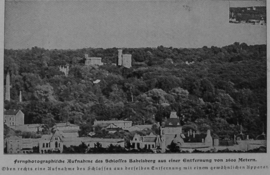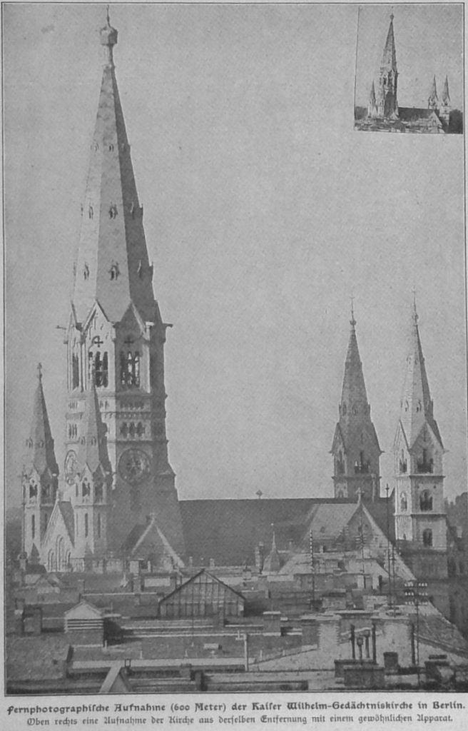 Dennoch besteht ein wesentlicher Unterschied in den Abmessungen eines gewöhnlichen und eines fernphotographischen Apparats, wie unsere Abbildung zeigt. Bei den hier zur Verwendung kommenden Abmessungen der Apparate gelingt es, ungefähr eine 10 bis 12fache lineare Vergrößerung mit dem Fernapparat gegen über dem gewöhnlichen Apparat zu erreichen. Mit dieser Vergrößerung lassen sich schon recht bemerkenswerte Resultate erreichen, wie unsere Abbildungen vom Schloß Babelsberg bei Potsdam, von der Kaiser Wilhelm-Gedächtniskirche in Berlin und namentlich von der Montblanc Kette zeigen.