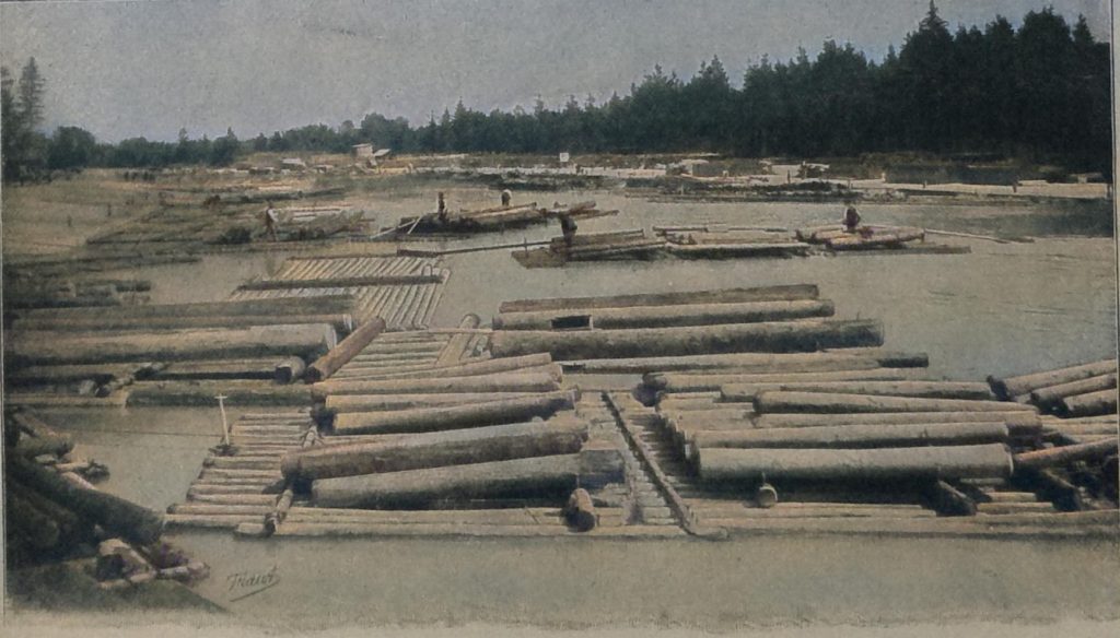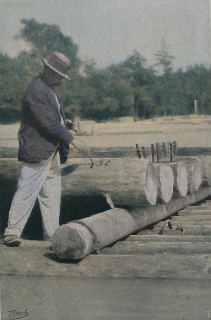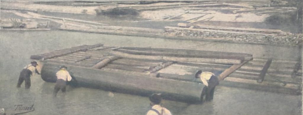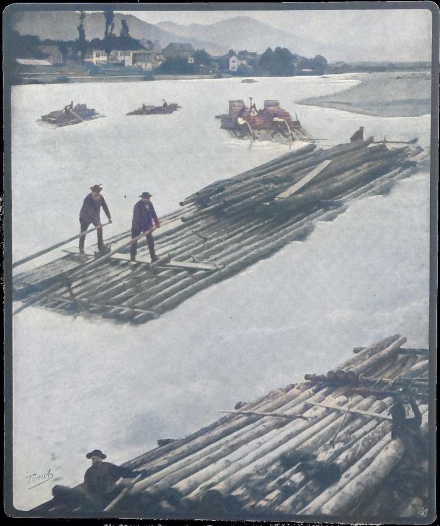 Die Flößer führen stets einen Vorrat von losen Holzscheiten mit sich. Der gehört für arme Kinder, die, wenn die Floßfahrt im Gange ist, an den Ufern stehn, um Holz zu erbetteln.