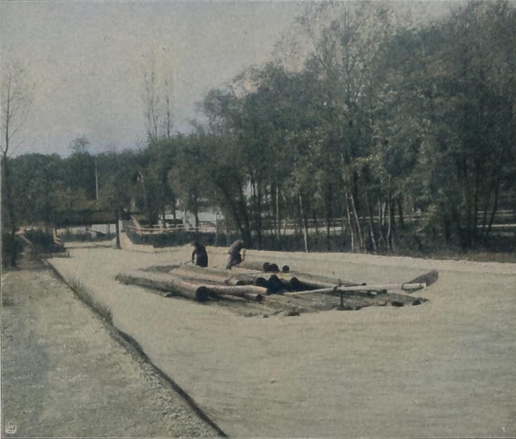 Jetzt ist der Landeplatz etwa eine Stunde oberhalb Münchens. Da kann man auf breiten Kiesbänken zwischen den hohen, bewaldeten Stromufern das Treiben der Flößer und das Ende der Flöße mit ansehn. Die letzteren werden auseinandergebrochen, die einzelnen Stämme werden durch vorgespannte Pferde auf den Kies herausgeschleift und auf Wagen verladen.