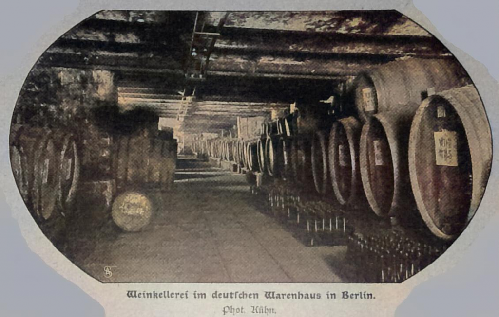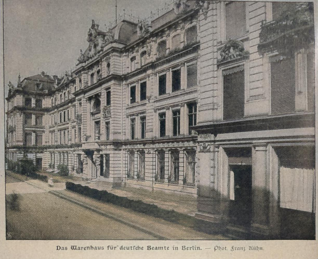 Auch in Deutschland wurde naturgemäß bald der Wunsch rege, durch eine Einrichtung nach dem Muster der englischen Institute es unsern Beamten und Offizieren zu ermöglichen, ihre Bekleidung und Ausrüstung sowie ihre Lebensbedürfnisse in guter Qualität zu billigen Preisen einzukaufen. Infolge dieser Bestrebungen wurden vor 20 Jahren der Deutsche Offiziersverein und vor 15 Jahren das Warenhaus für deutsche Beamte ins Leben gerufen. Während die englischen Institute rein kaufmännischer Natur sind und keine weiteren gemeinnützigen Tendenzen verfolgen, wurde für die beiden deutschen Vereinigungen als alleiniger Zweck die Gemeinnützigkeit ihrer Bestrebungen und die Wahrung der wirtschaftlichen Interessen ihrer Mitglieder auf allen ihren Tätigkeitsgebieten hingestellt. Der Offiziersverein eröffnete seine Geschäftstätigkeit in Berlin Berlin am 1. April 1884 und zählt heute nach zwanzig Jahren 52 000 stimmberechtigte und 2000 außerordentliche Mitglieder, von denen rund 35 000 Waren vom Verein beziehen, während die übrigen zum größeren Teil die andern vom Verein gebotenen Vorteile, die zahlreichen Verkehrserleichterungen, die Vermittlung von Anstellungen, Auskünfte usw. ausnützen. Das Warenhaus für deutsche Beamte wurde im Jahr 1889 als Aktiengesellschaft ins Leben gerufen. Die Leitung des Warenhauses ruht jetzt in den Händen des Vereins der Kaufberechtigten des Warenhauses. Das Warenhaus bezweckt, den deutschen Beamten durch Bareinkauf und Barverkauf gute Waren zu möglichst niedrigen Preisen zu liefern, ihnen Verkehrserleichterungen und Preisermäßigungen in Hotels und Bädern, bei Versicherungsgesellschaften usw. zu erwirken, ihnen gute Geschäfte zu empfehlen und aus den Eintrittsgeldern und Ueberschüssen einen Darlehnsfonds zu bilden. Dieses Ziel ist erreicht worden. Der Verein besitzt ein eigenes stattliches Gebäude in der Bunsenstraße (Abb.) das nicht nur die Verkaufs- und Verwaltungsräume enthält, sondern auch eine mächtige Weinkellerei (Abb.) und ein Hotel für seine Mitglieder, die auf Reisen nach Berlin kommen.