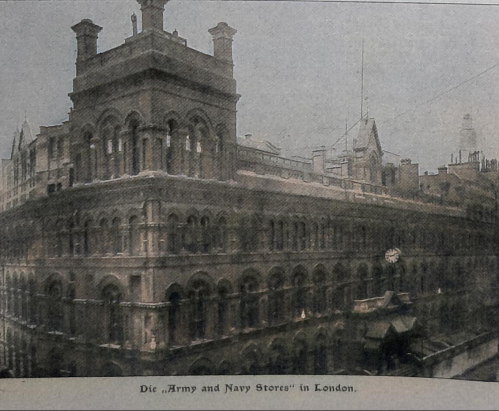 Die niedrigen Preise für Militäreffekten, Kleider, Wäsche und alle notwendigen Artikel des Haushalts und die großen pekuniären Ersparnisse, die für die Teilnehmer des Vereins hieraus erwuchsen, waren so ins Auge fallend, daß aus allen Teilen der britischen Armee und Flotte sich zahlreiche Mitglieder zum Eintritt in den Verein meldeten. Die Vereinigung erbaute sich in London ein großes Warenhaus und Verkaufslokal, die „Army and Navy Stores“ in Regentstreet (Abb.), und war nach wenigen Jahren schon nicht mehr imstande, dem Andrang zu genügen.